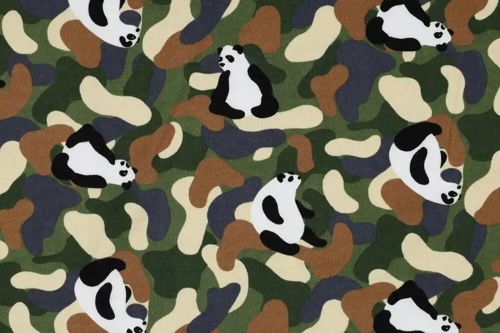 Mooie soft sweat jogging stof met een print van panda’s en camouflage.