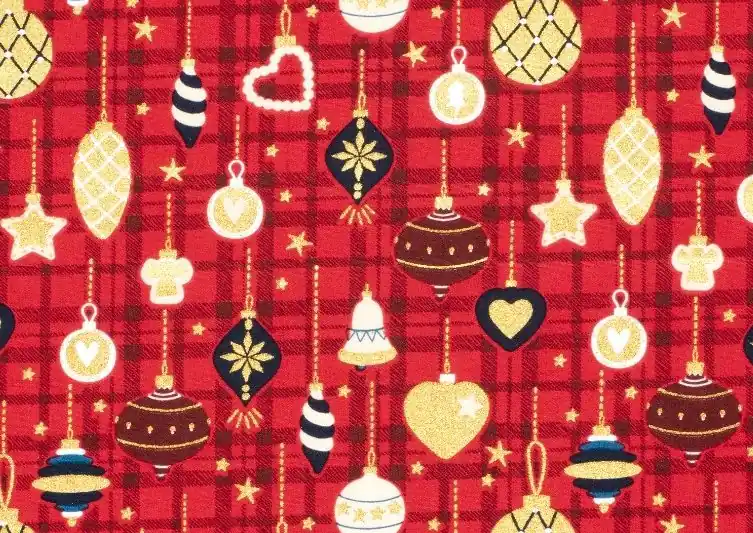 Mooie katoenen kerst stof met ballen in foliedruk.