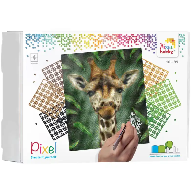 Pixelhobby Giraf – Pixelhobby is een creatieve hobby, waar je uren zoet mee kunt zijn. Het vergt enige concentratie maar je hoeft er niet veel bij na te denken, wat super ontspannend werkt! De pixels kunnen met de vingers of met een pincet op de basisplaat worden gedrukt. De pixels zitten direct vast, er is geen lijm of strijkijzer nodig.