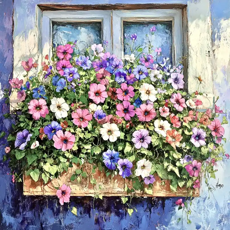 Breng kleur en romantiek in huis met de Bloemen aan het raam Diamond Painting! Deze sfeervolle afbeelding toont een schilderachtig venster met een uitbundige bloemenbak, boordevol bloeiende petunia’s en andere zomerse bloemen in allerlei tinten roze, paars, wit en blauw. De bloemen lijken bijna uit het raam te springen van kleur en leven, terwijl de licht verweerde vensterbank en het blauw getinte pleisterwerk zorgen voor een dromerige, zuidelijke sfeer.
