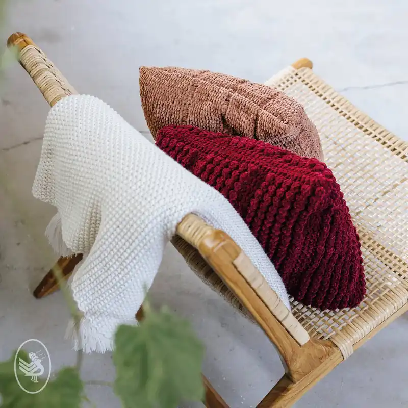Haakpakket: Velvet Popcorn Kussen – Het Durable Velvet garen heeft een bijzondere textuur, waar je snel diepte mee creëert. Door gebruik te maken van de popcorn steek krijg je een mooi en stoer reliëf wat dit kussen net even wat extra’s geeft. Op de foto is dit het onderste kussen.
