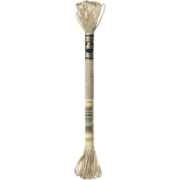 DMC Light Effects (Effet Lumière) borduurgaren met kleurnummer E677, samengesteld uit 6 gemakkelijk te splitsen draden. Een speciaal assortiment garen met een metallic glans voor de mooiste lichteffecten.