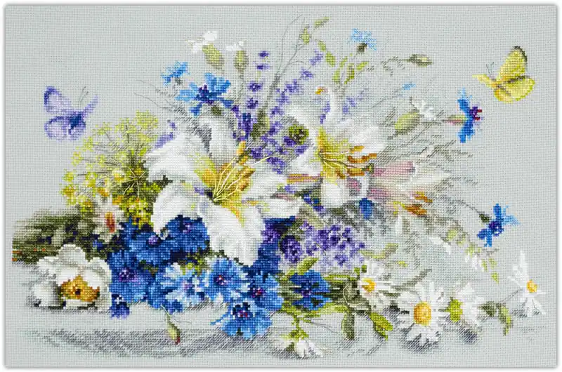 Het pakket wordt compleet geleverd inclusief de benodigde borduurstof, garens, patroon, naald en beschrijving.