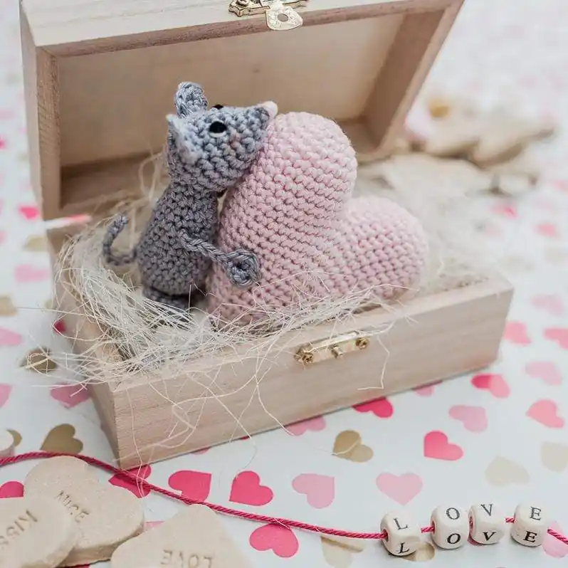 Garenpakket: Februari Liefdes muisje – Met het pakket voor het liefdes muisje heb je alle materialen in huis om direct aan de slag te gaan. Het patroon kun je los bestellen of vind je terug in de Durable Agenda 2022.