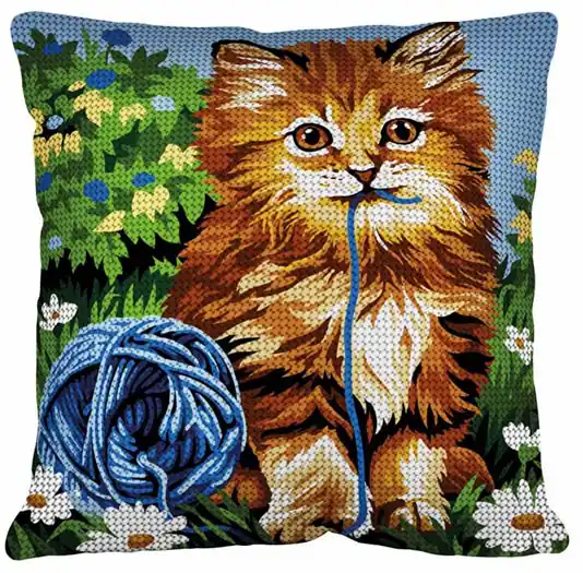 Kat met bolletje wol borduurkussen – Margot de Paris borduurpakket