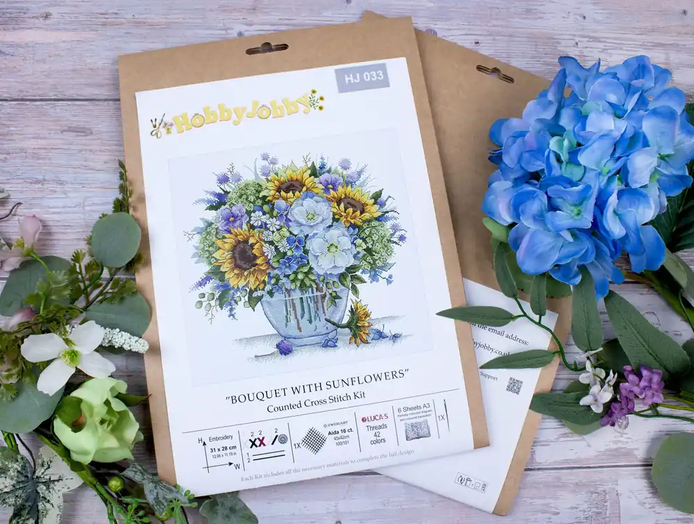 Het pakket wordt compleet geleverd inclusief de benodigde borduurstof, garens, patroon, naald en beschrijving.