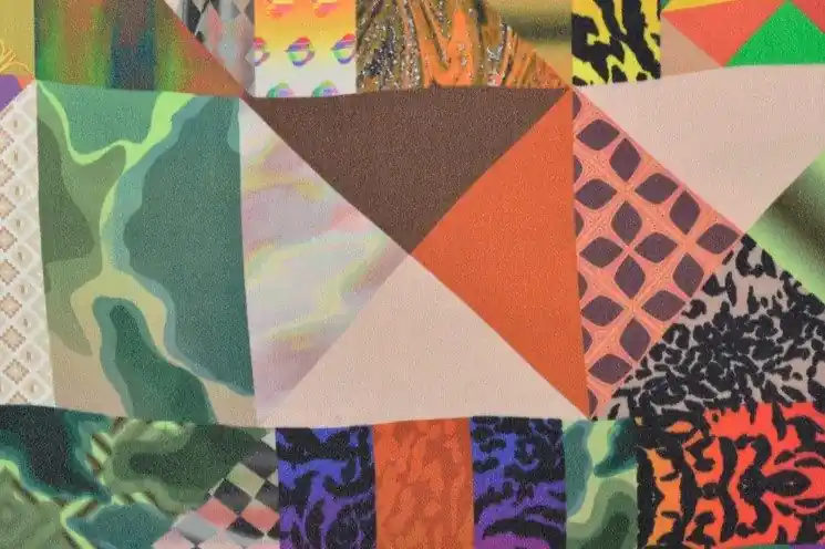 Mooie glanzende viscose stof met een print van abstracte vlakken.